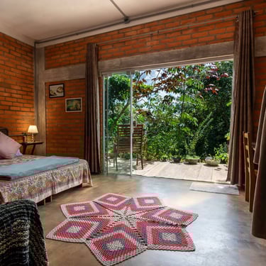 O Espaço Aricá é um refúgio que prioriza a integração com a natureza através de um design contemporâneo e sustentável, fugindo totalmente do estilo de hotelaria convencional. A arquitetura com grandes aberturas de vidro trazem o Cerrado para dentro do quarto.